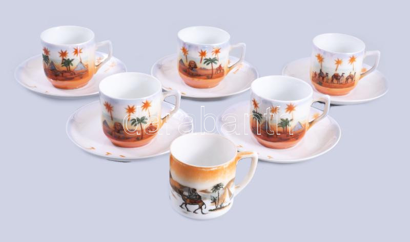 5 darab egyiptomi mintás porcelán csésze alátéttel d: 11,5 cm, extra csészével.