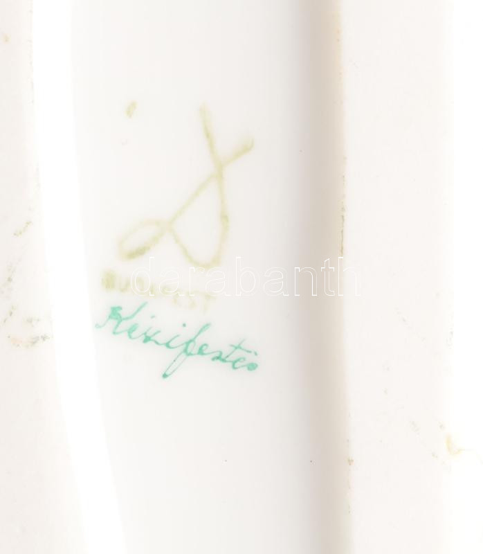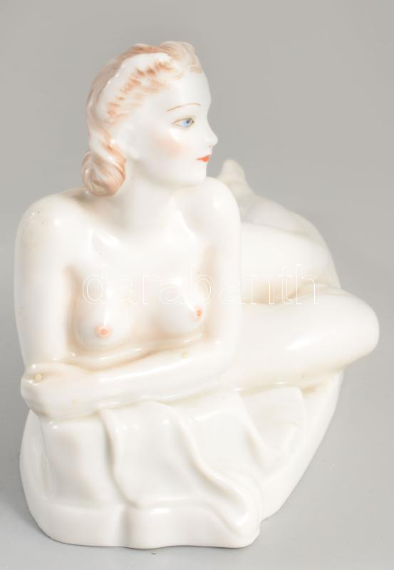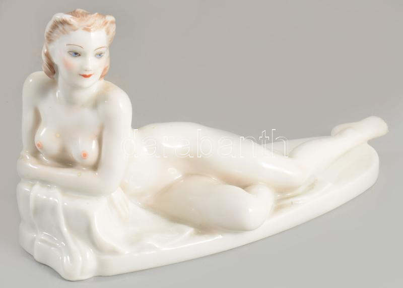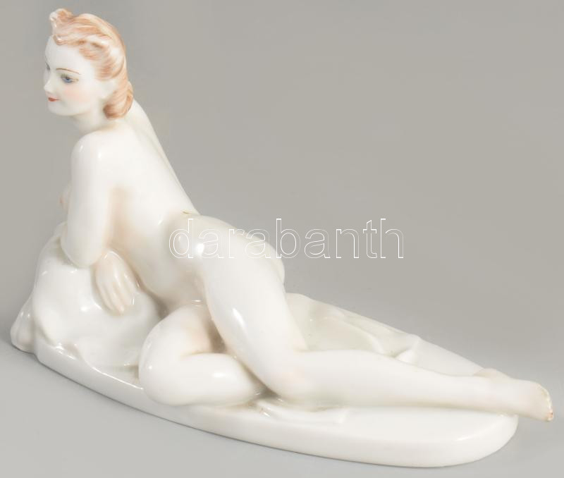 Drasche fekvő akt. Terv: Donner Mária Gertrúd (1902-1986). Jelzett, kézzel festett, alján ütődésnyommal, 16x9,5 cm. Ritka!