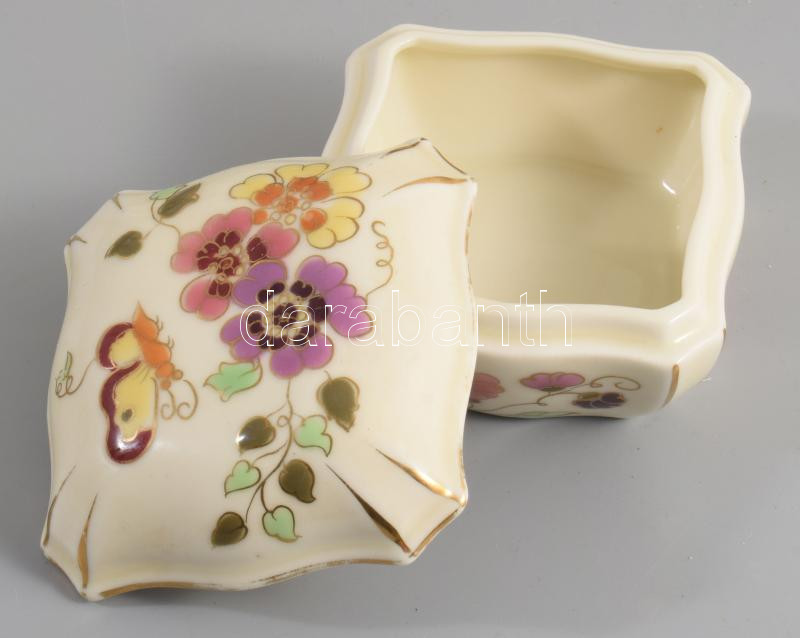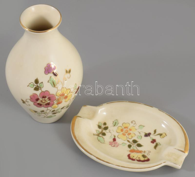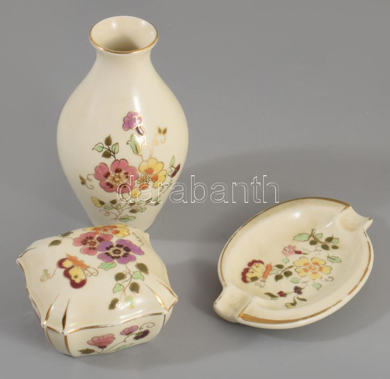 Zsolnay pillangó mintás asztali szett, hamuzó, váza, bonbonier. Jelzett, kopással, m: 12,5 cm