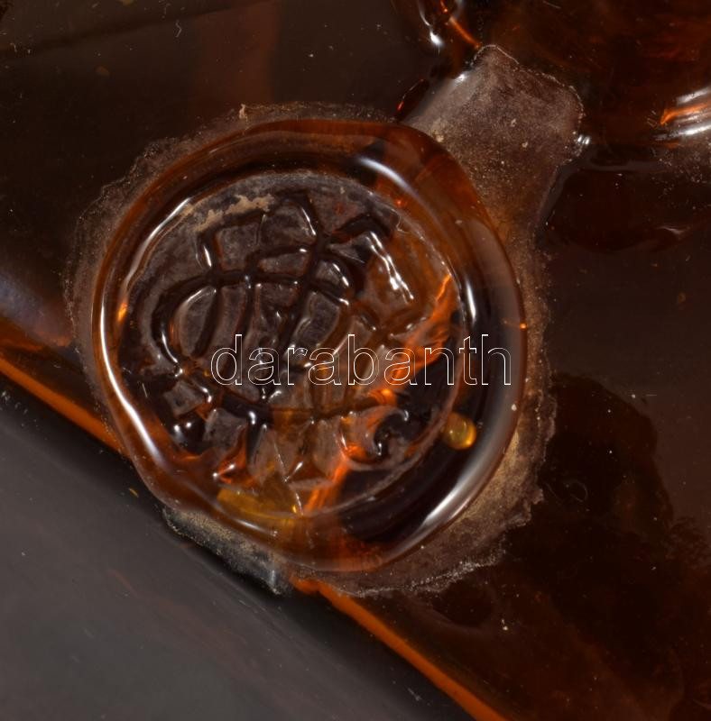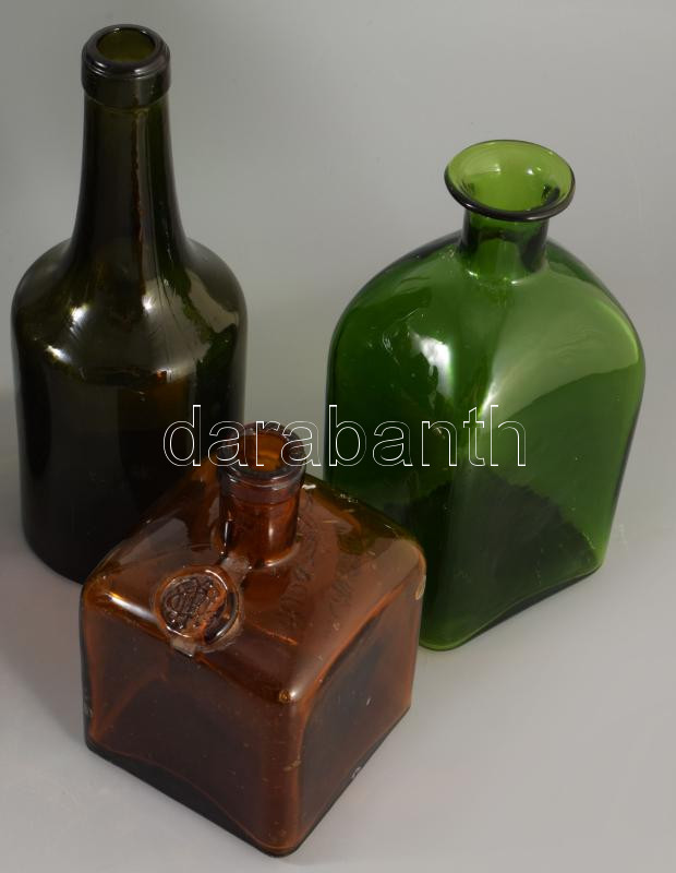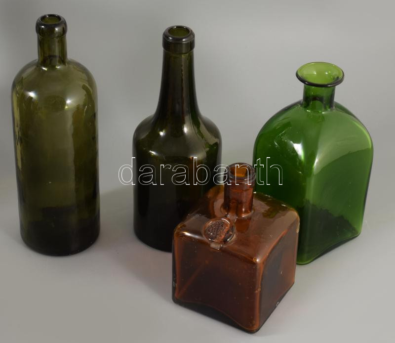 4 db régi likőrös üveg, egyik Gschwindt felirattal. 15-24 cm Hibátlanok