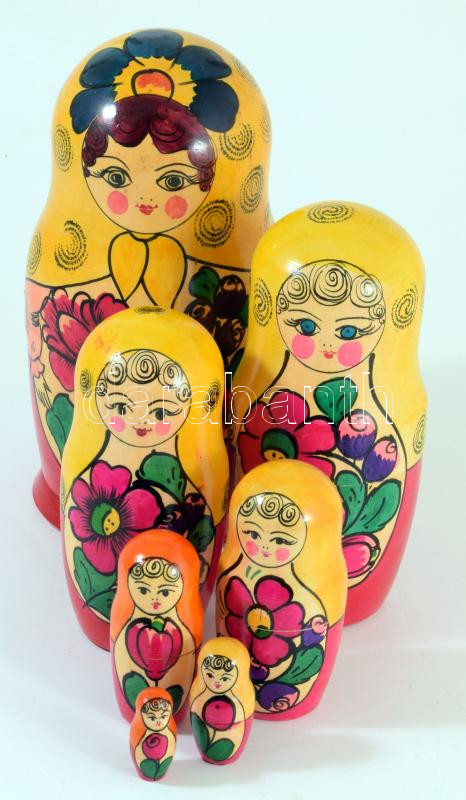 7 darabos matrjoska baba, kézzel festett fa. 22 cm ig