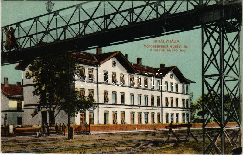 Királyháza, Korolevo, Královo nad Tisou; Vöröskereszt épület és a vasúti átjáróhíd a vasútállomásnál. Vasúti levelezőlapárusítás 247. / Red Cross building at the railway station, pedestrian bridge (EK)
