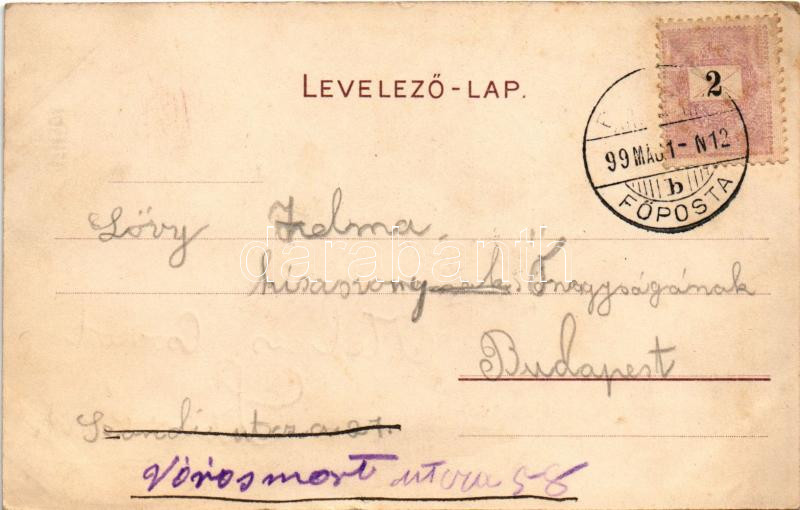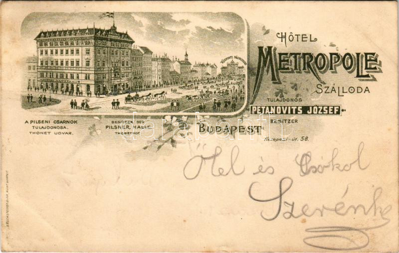 1899 Budapest VII. Petánovits József Hotel Metropole szálloda, üzletek, kávéház, Központi (Keleti) pályaudvar. Kerepesi (Rákóczi) út 58. Bruchsteiner és Fia Műintézete kiadása. Art Nouveau, floral (fl)