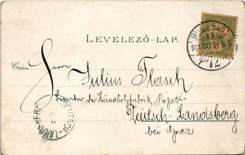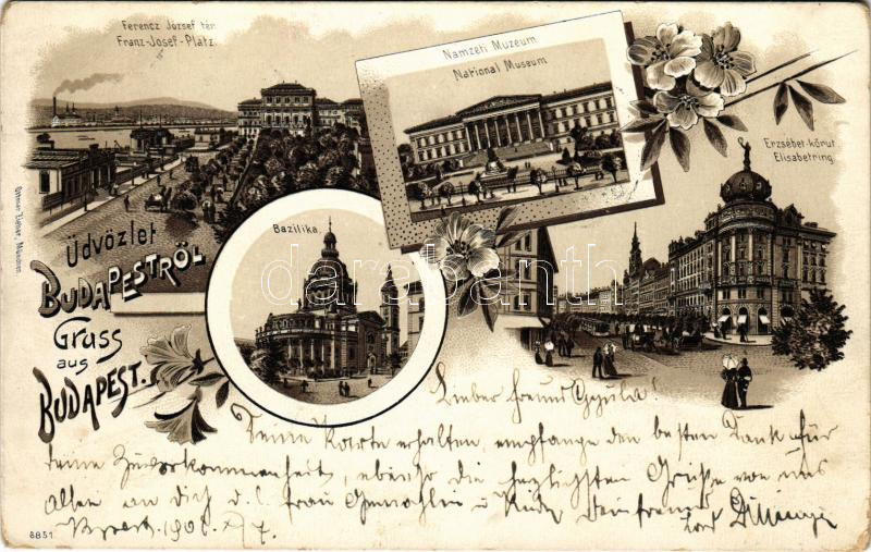 1901 Budapest, Ferenc József tér, Nemzeti Múzeum, Bazilika, Erzsébet körút. Ottmar Zieher Art Nouveau, floral, litho (EM)