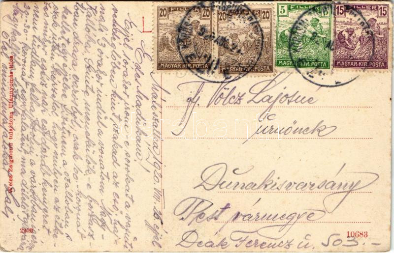 1920 Mátészalka, Római katolikus templom. Weisz Zsigmond tulajdona, W. L. (?) 2250. + "KŐRÖSMEZŐ - PÜSPÖKLADÁNY - BUDAPEST 20 E" vasúti mozgóposta bélyegző (EK)
