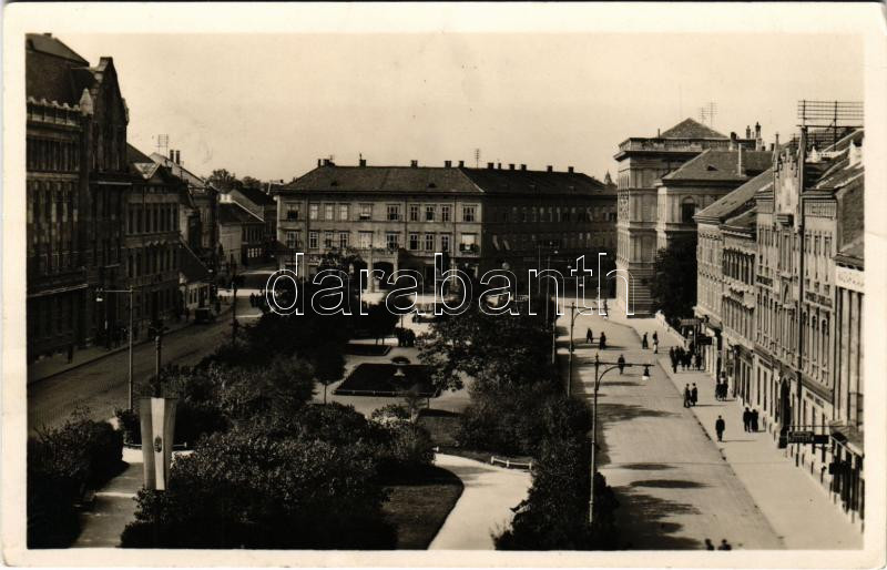 1942 Sopron, Széchenyi tér, Országzászló, üzletek (EK)