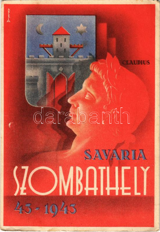 1943 Szombathely, Emlék Szombathely 1900 éves városi múltjából. Tiberius Claudius római császár 1900 évvel ezelőtt Kr. u. 43-ban Savaria névvel városi rangra emelte Szombathelyt (EK)