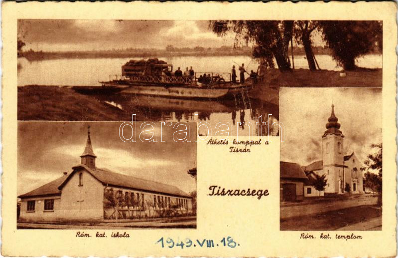 1949 Tiszacsege, Átkelés csónakkal a Tiszán, római katolikus templom és elemi iskola. Tréki I. kiadása