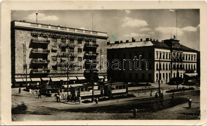 1955 Debrecen, utcarészlet, villamos, MÁV Igazgatóság, Néplap Kiadóhivatal, cipőüzlet. Képzőművészeti Alap (EB)