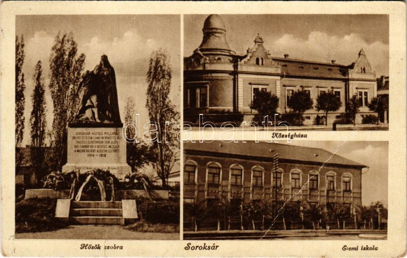 Budapest XXIII. Soroksár, Hősök szobra, Községháza, Elemi iskola. Csuka Károly kiadása (fa)