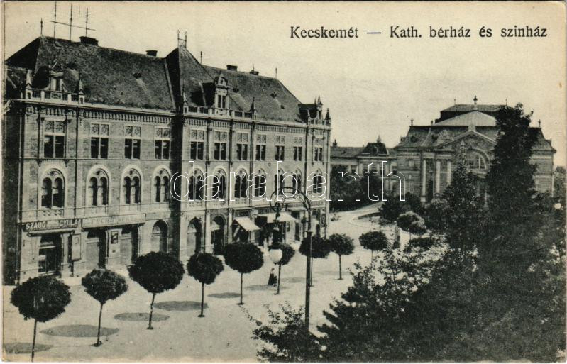 Kecskemét, Katolikus bérház és színház, Szabó és Fuchs üzlete. Burián Lajos kiadása (EK)