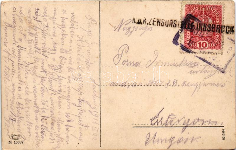 1918 Val d'Ega, Eggental (Südtirol); Partie im Eggental gegen Latemar. Dolomitenstrasse / valley, road + "K.u.k. Zensurstelle Innsbruck" (worn corners)