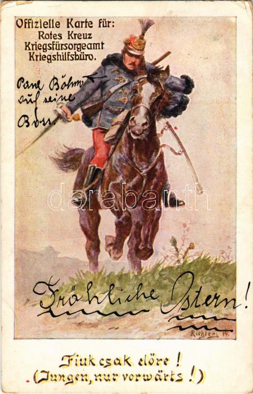 1915 Fiúk csak előre! / Offizielle Karte für Rotes Kreuz, Kriegsfürsorgeamt, Kriegshilfsbüro. Schwarz-Gelbes Kreuz / WWI Austro-Hungarian K.u.K. military art postcard with Hussar s: E. Richter M. (EK)