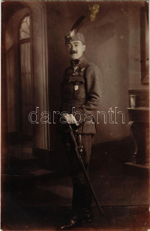 1920 Magyar katonatiszt kitüntetésekkel: Koronás Arany Érdemkereszt, Jubileumi Emlékérem, ?, Katonai Jubileumi Kereszt, Székely Hadosztály jelvénye a zseb alatt / K.u.k. Hungarian military officer with medals and "Székely/Szekler Division" badge. photo