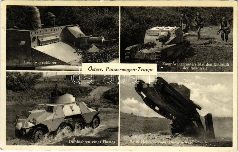 Österrich Panzerwagen-Truppe. Kampfwagenführer, Kampfwagen unterstützt den Einbruch der Infanterie, Durchfahren eines Flusses, Beim Nehemn eines Hindernisses. E. Schreier Nr. 54. / osztrák harckocsi gyakorlatozás közben / WWÍI Austrian military, tank training