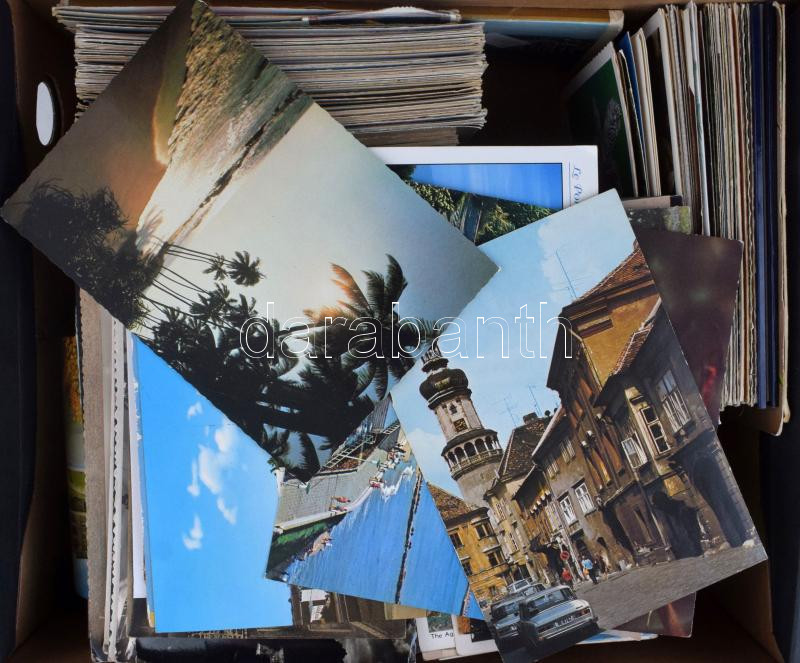 Kb. 870 db MODERN város, motívum képeslap cipősdobozban / Cca. 870 modern town and motive postcards in a shoe box