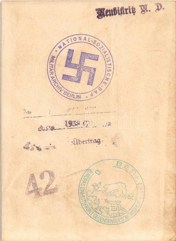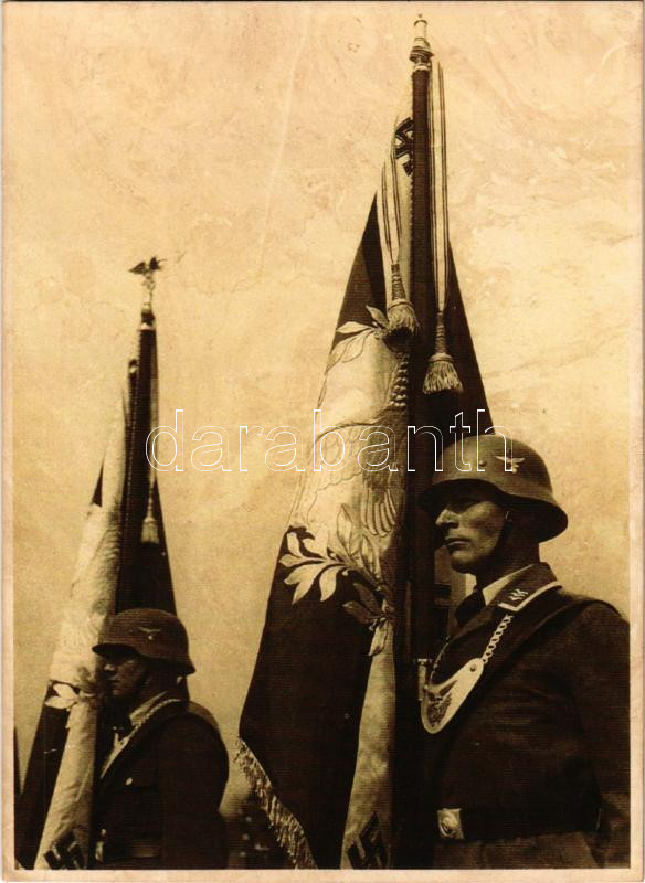 1938 Német katonák horogkeresztes zászlókkal / WWII German NSDAP Nazi military, soldiers. photo + So. Stpl. (felületi sérülés / surface damage)