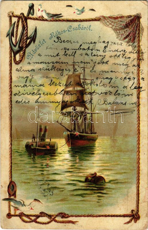 1899 Üdvözlet Rákos-Csabáról, hajós művészlap / boat art postcard. litho (felületi sérülés / surface damage)