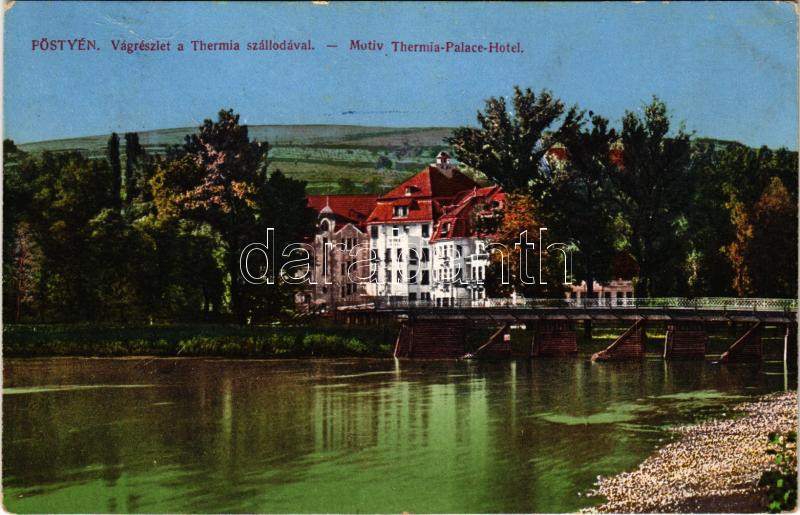 1915 Pöstyén, Piestany; Vág részlet a Thermia szállodával. Fuchs Margit kiadása / Váh riverside with spa hotel and bridge (kopott sarkak / worn corners)