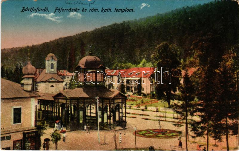 1917 Bártfa, Bártfafürdő, Bardejovské Kúpele, Bardiov, Bardejov; Főforrás tér és római katolikus templom, Eschwig üzlete. Rosenfeld Salamon kiadása / spa, Catholic church, shop (EK)