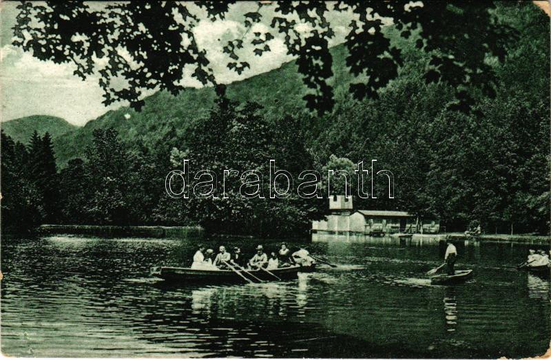 Trencsénteplic, Trencianske Teplice; Baracska-tó az uszodával és csónakázókkal / lake with swimming pool and rowing boats (EK)