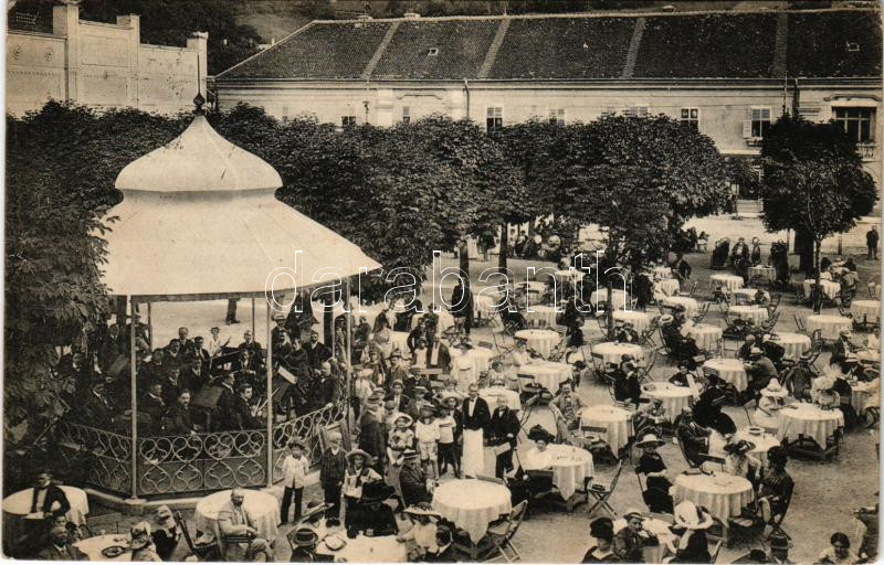 Trencsénteplic, Trencianske Teplice; Fő tér a zenepavilonnal, zenekar. Wertheim Zsigmond kiadása / Hauptplatz mit Musikpavillon / main square, music pavilion with musicians (EK)