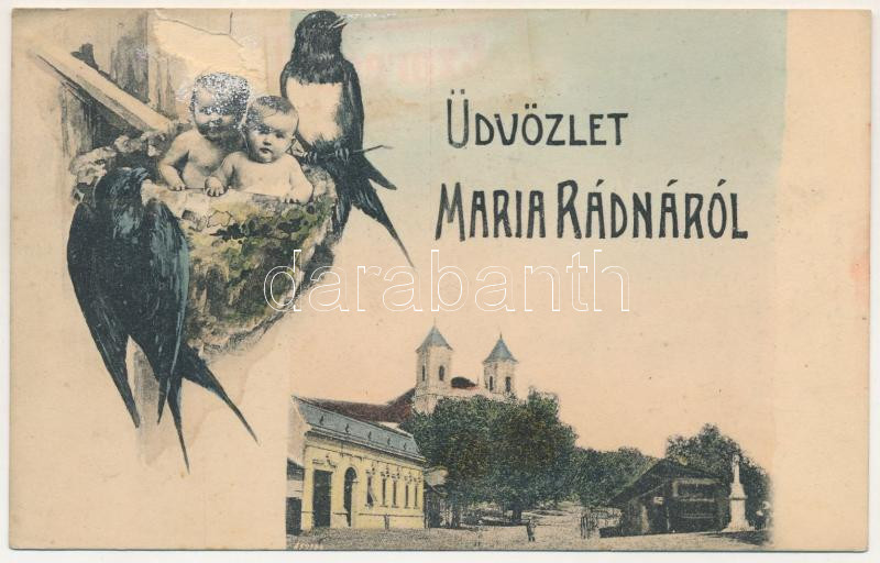 1907 Máriaradna, Mária-Radna, Radna (Lippa, Lipova); kegytemplom. Gregor Fischer kiadása, montázs babákkal fecskefészekben / pilgrimage church, montage with babies in the swallows' nest (b)