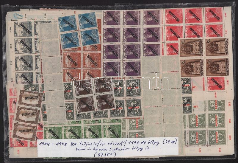 1904-1948 1.196 db bélyeg (39 klf) ívekben és ívtöredékekben, köztük hármaslyukasztású bélyegek is, nagy tasakban (67.500)