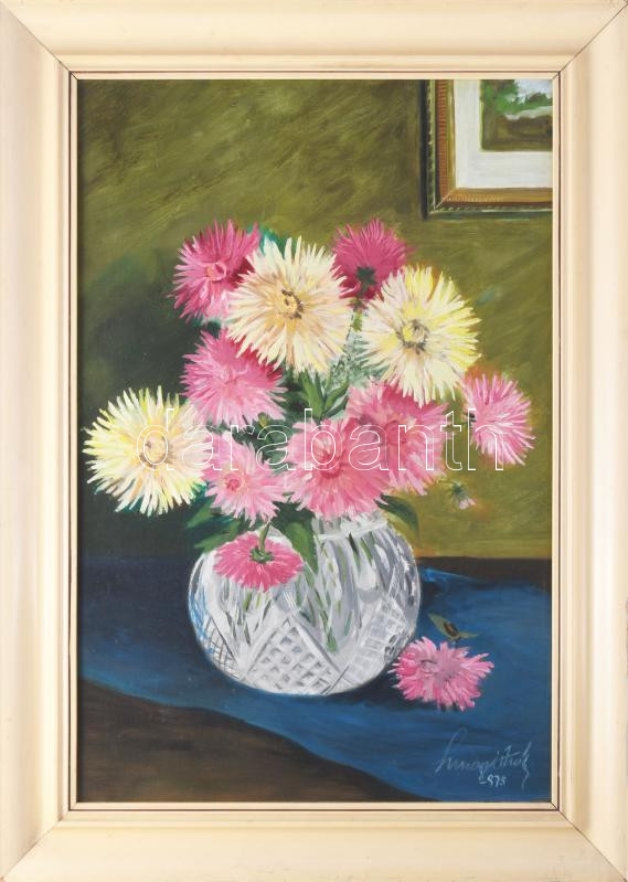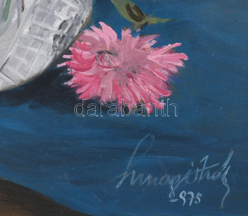 Magistrák Károly (-): Enteriőr képpel és virággal, 1975. Olaj, vászon, jelzett. Fakeretben. 61×41 cm
