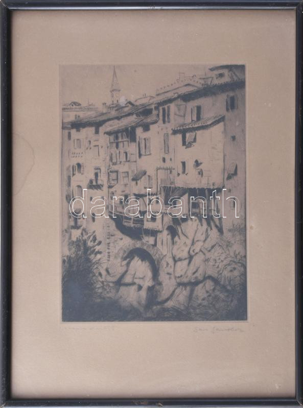 Olvashatatlan jelzéssel: Pont-en-Royans. Rézkarc, papír, jelzett, lapszéli ázásnyommal, üvegezett fakeretben. 23,5×18 cm