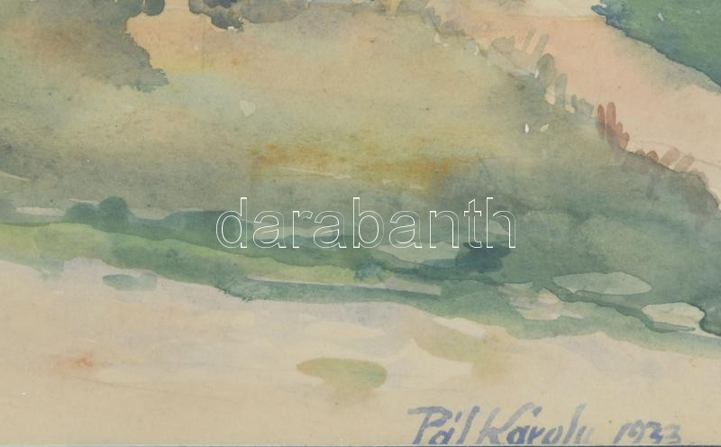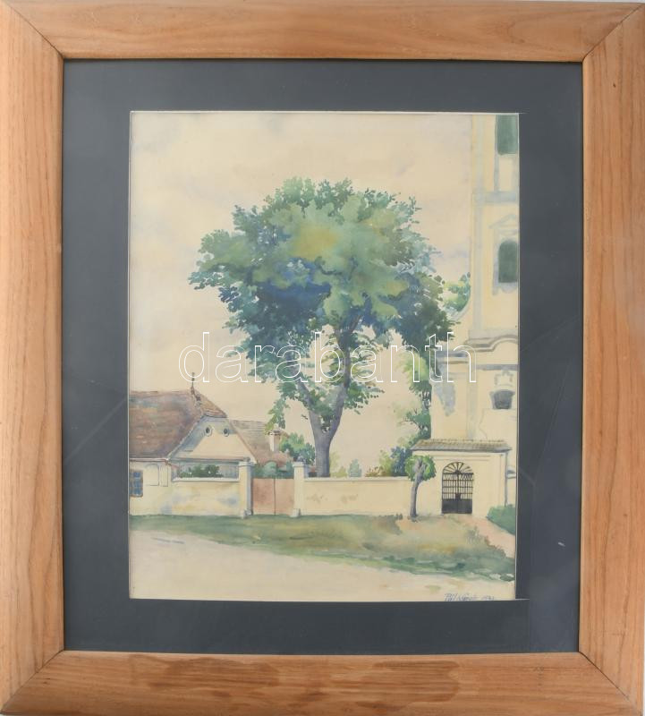 Pál Károly jelzéssel: Falurészlet templommal, 1933. Akvarell, papír, üvegezett fakeretben, 39,5×30 cm