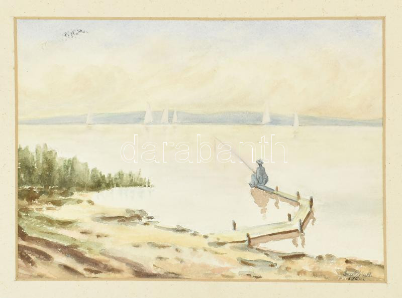 Szakály A. jelzéssel: Balatoni vitorlások és horgász. Akvarell, papír. Paszpartuban. 19,5×27,5 cm