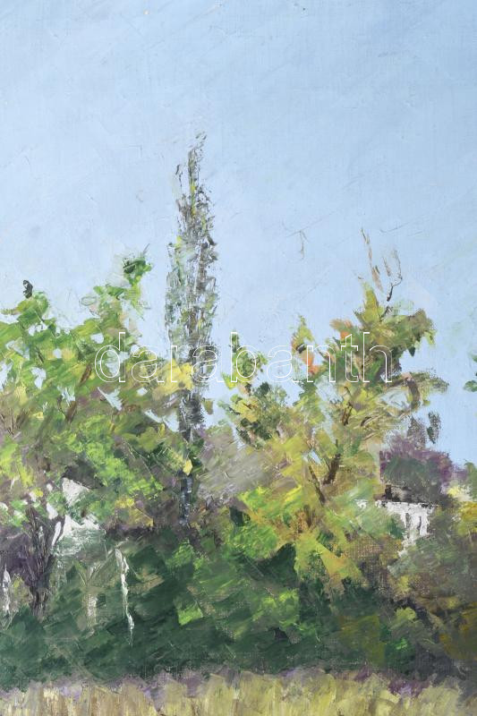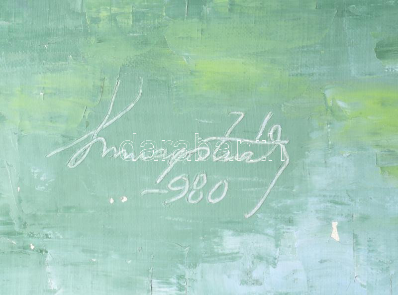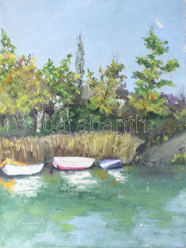 Magistrák Károly (-): Csendes part, 1980. Olaj, vászon, jelzett. Sérült. 80×60 cm