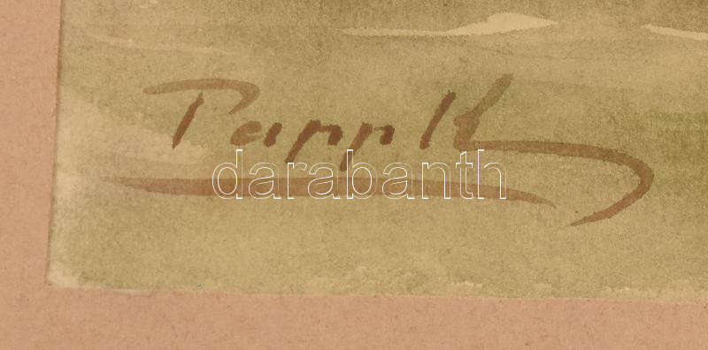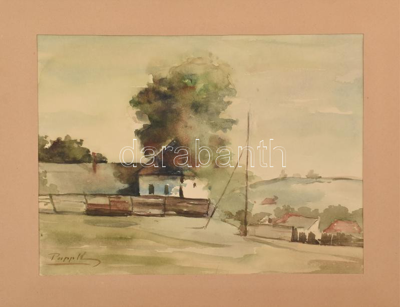 Papp Károly (?-): Faluszéle. Akvarell, papír, jelzett. Paszpartuban. 28x37,5 cm