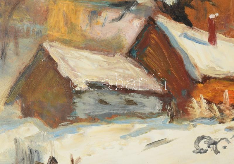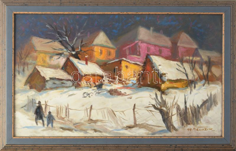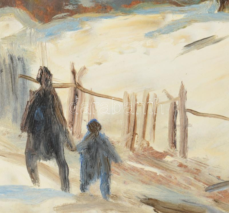 Przudzik József (1926-2019): Séta a hóban. Olaj, karton, jelzett, fakeretben, 27×45 cm