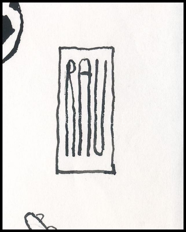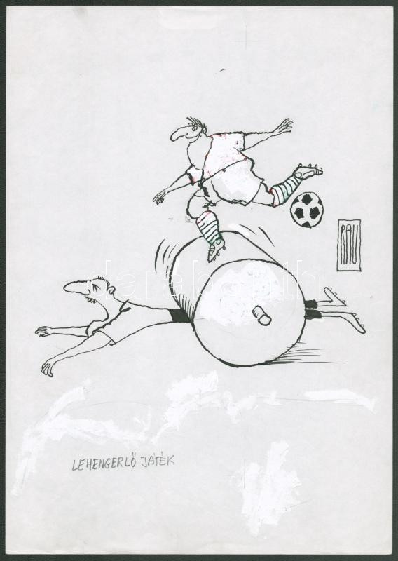 Rau Tibor (1934-2009): Lehengerlő játék (futball témájú karikatúra). Tus, fedőfehér, papír, jelzett. 30x21 cm