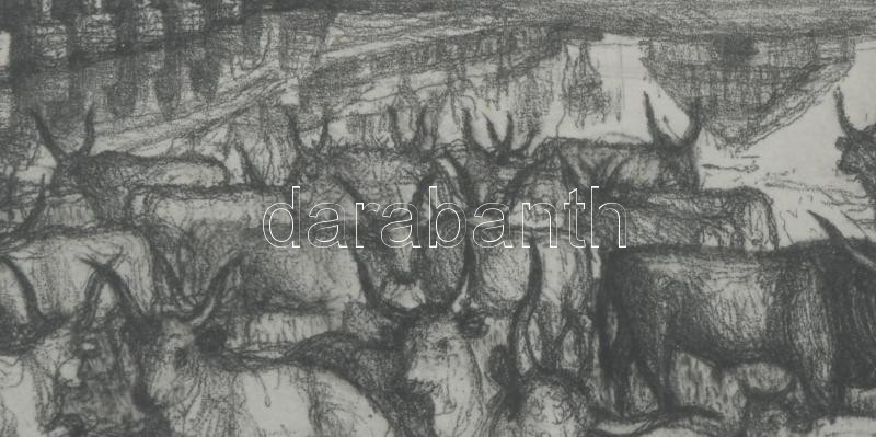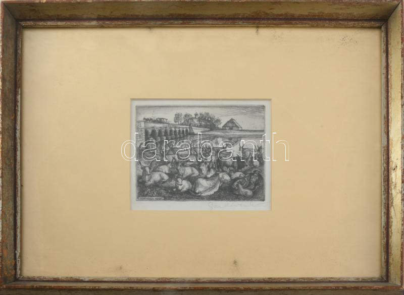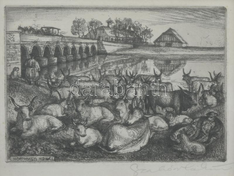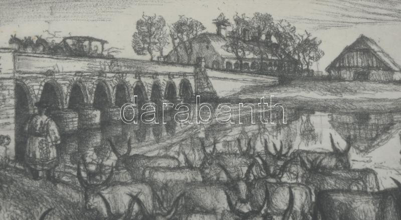 Szabó Vladimír (1905-1991): Hortobágyi hídnál. Rézkarc, papír, jelzett. Üvegezett fakeretben, 10,5×13,5 cm