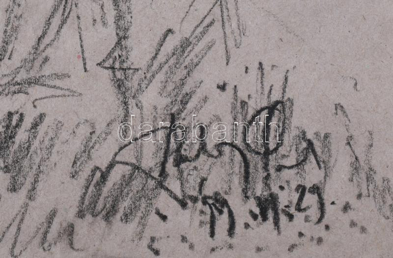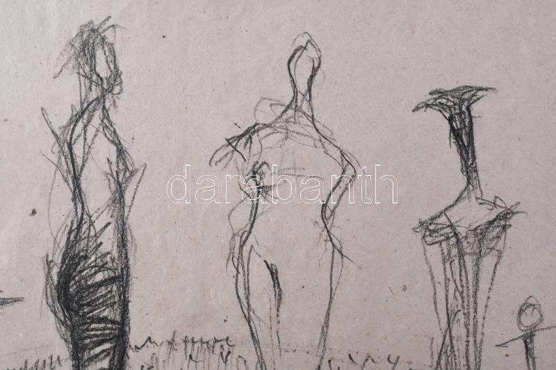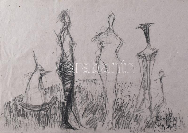 Szalay Pál (1953-2015): Alakok és kutya. Szén, papír. Jelezve jobbra lent. 30,5x43 cm