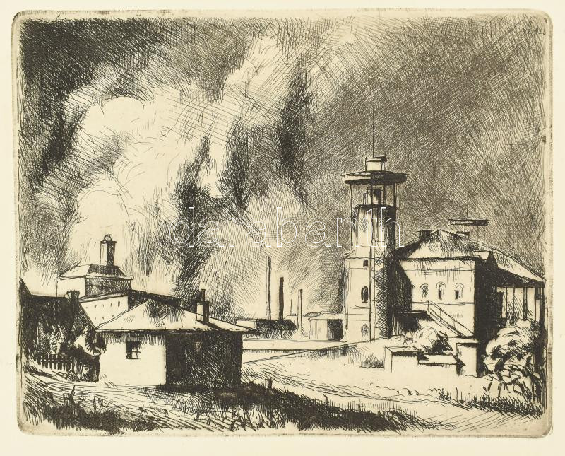 Szőnyi István (1894-1960): Külváros. Rézkarc, papír, jelzés nélkül, hátoldalán Palota Galéria bélyegzőjével, 16,5×21 cm