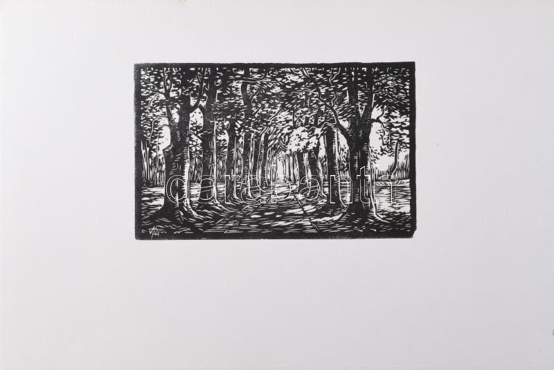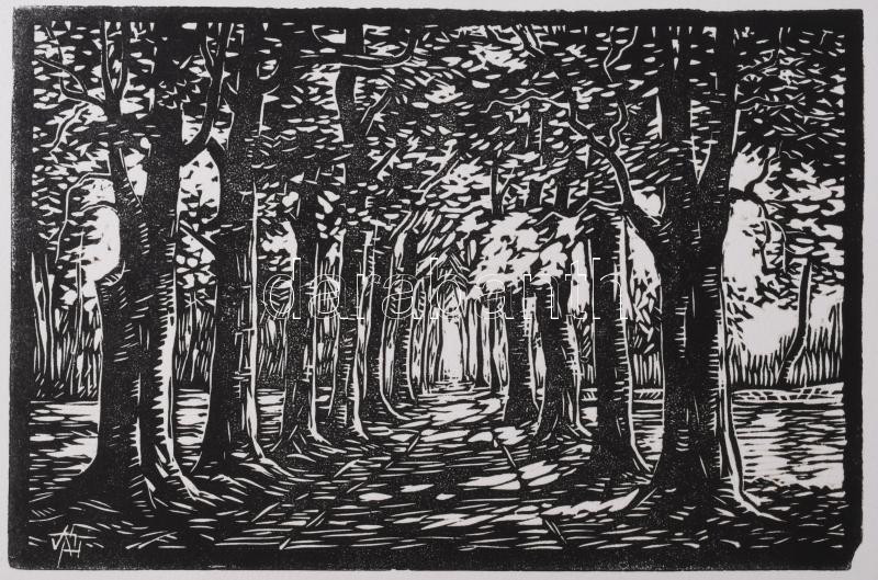 Váli Zoltán (1910-1994): Árnyas út. Linómetszet, papír, jelzett a metszeten. 14x21 cm
