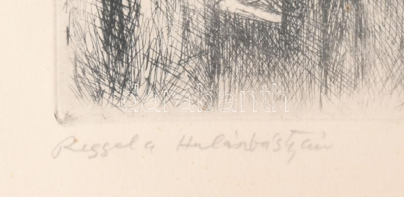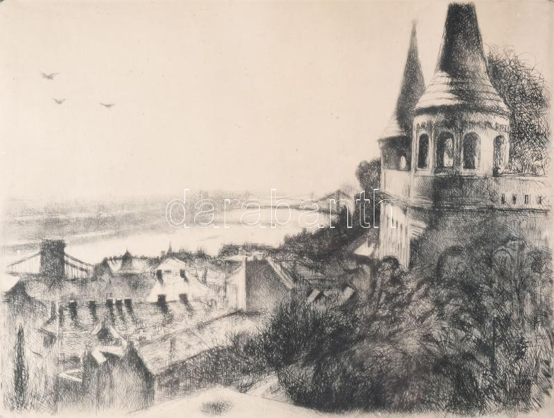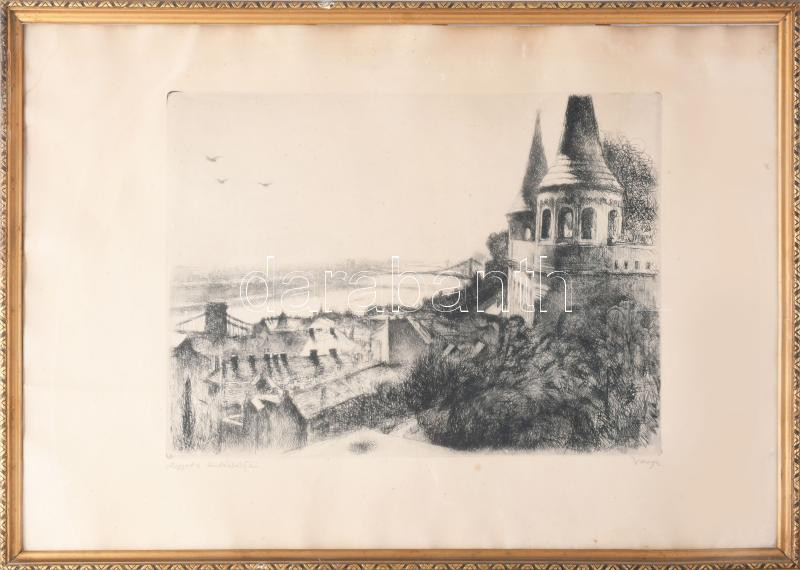 Varga Nándor Lajos (1895-1978): Reggel a Halászbástyán. Rézkarc, papír, jelzett, 29,5x39,5 cm. Lapszéli ázásnyomokkal. Üvegezett fakeretben.