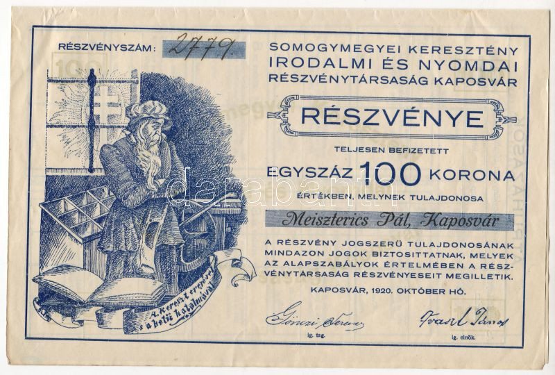 1920. "Somogymegyei Keresztény Irodalmi és Nyomdai Részvénytársaság Ka...
