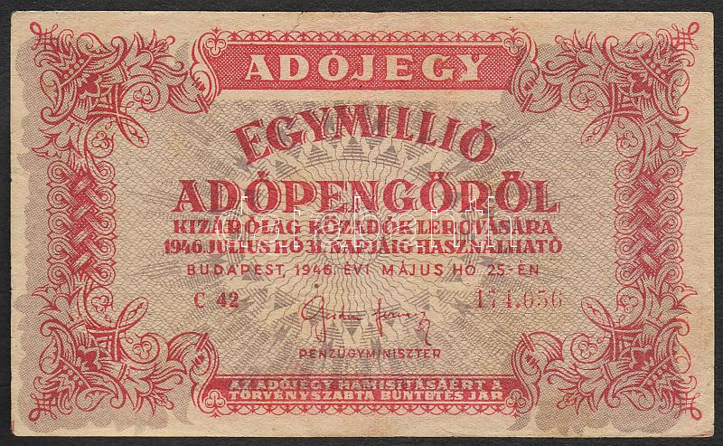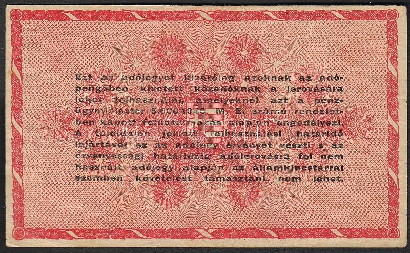 1946. 1000.000Adópengő 6 jegyű számmal, hátoldalon fordított címerrel,...