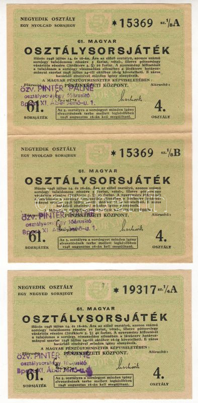 1948. 61.Magyar Osztálysorsjáték 1/4 sorsjegy részvízjellel + 1/8 sors...