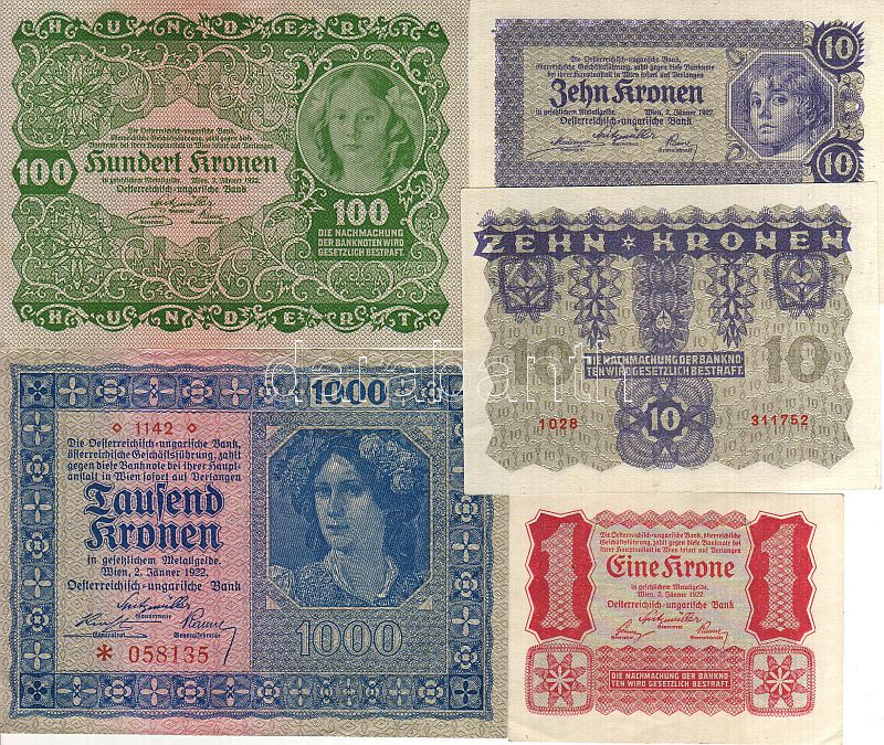 Ausztria/Osztrák-Magyar Bank kiadása 1922. 1K, 10K (2x) kevés ugrású sorszámokkal!, 100K, 1000K T:I,I-