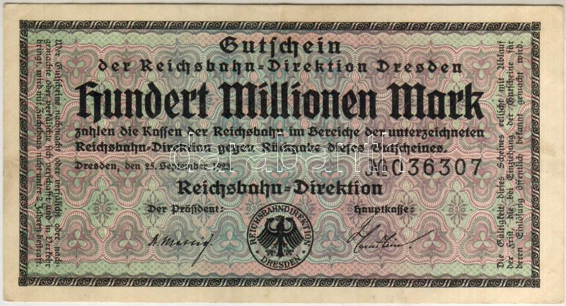 Német Birodalom/Reichsbahndirektion Dresden 1923. 100.000.000M T:I