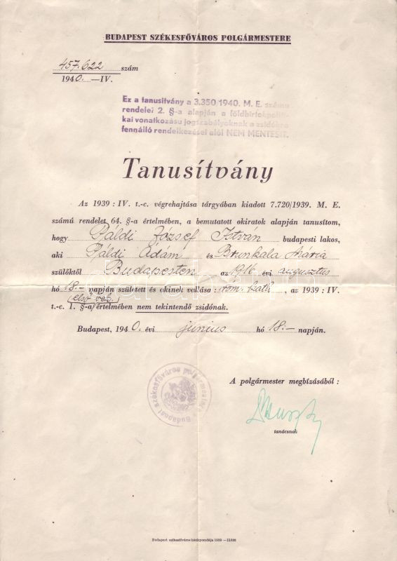 1940 Zsidótörvény alól mentesítő tanusítvány