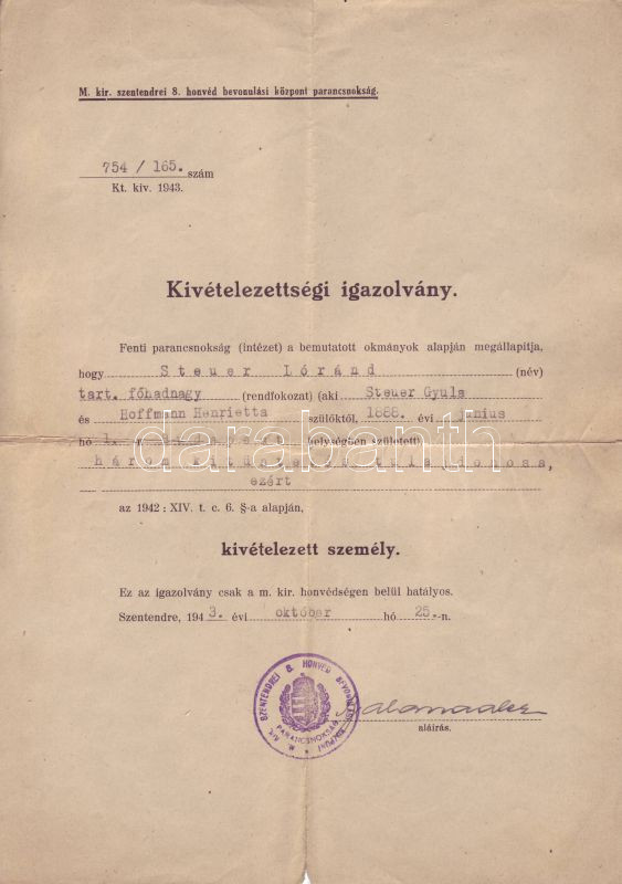 https://www.darabanth.com/en/52-Online-auction/52.0/Other-collectibles/~239/1943-Kivetelezettsegi-igazolvany-Steuer-Lorand-kituntetett-zsido-tartalekos-fohadnagy-rC3~II102576