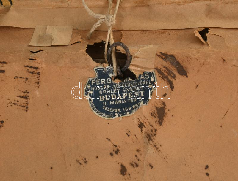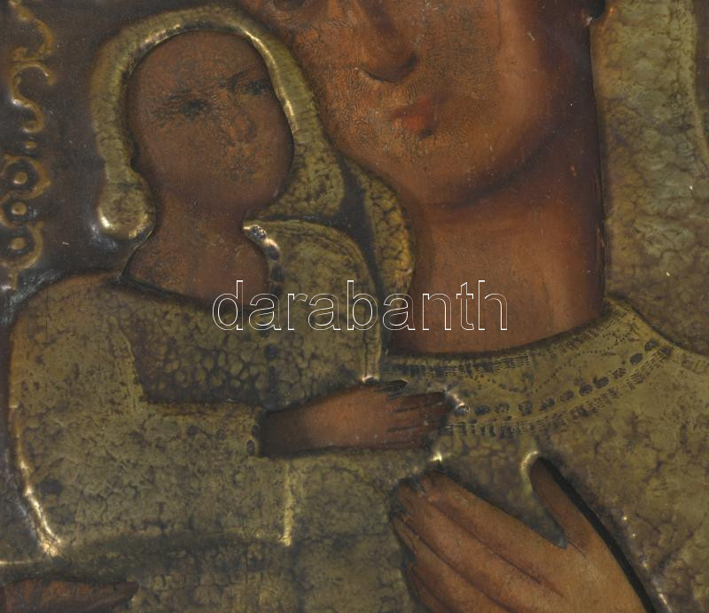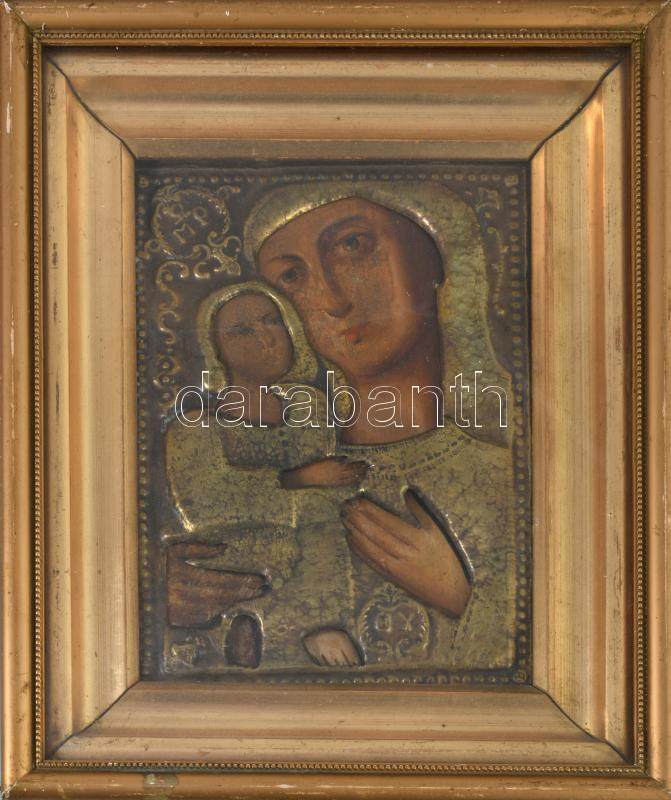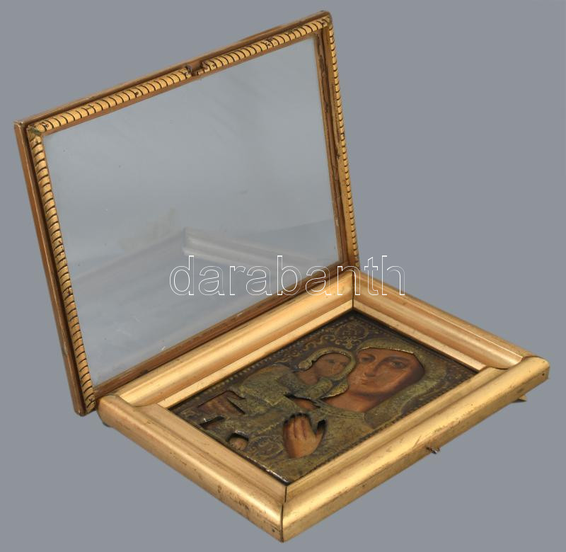 Ikon - Mária a kisdeddel. cca 20. sz. eleje, feltehetően görög, réz okláddal, nyitható üvegezett keretezésben, 23x16 cm, 34x27 cm