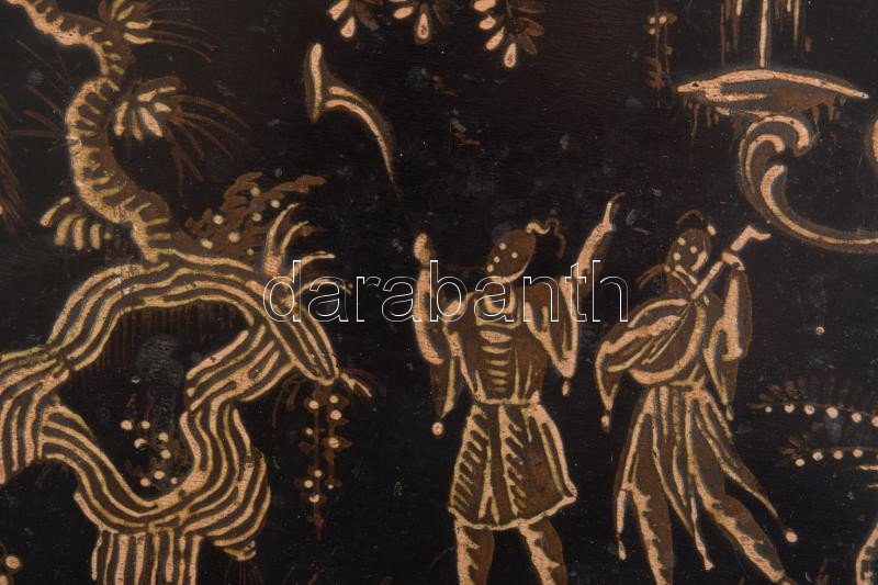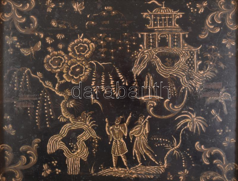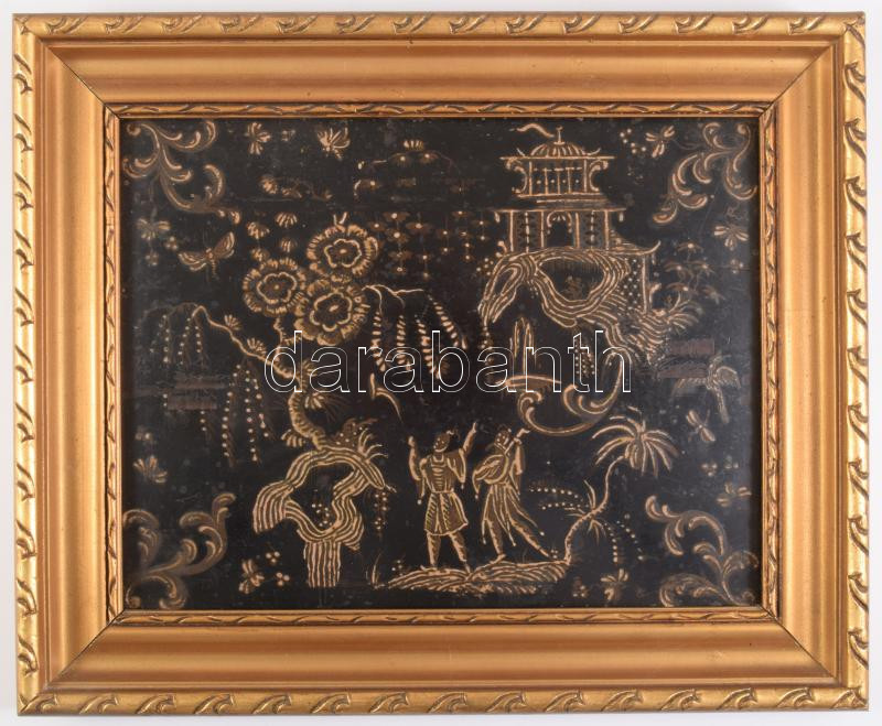 cca 19. sz. közepe-második fele, kínai vagy japán lakkozott fa kép pagodával, emberalakokkal és növényi ornamentikával, kopással, keretben, 19x24 cm